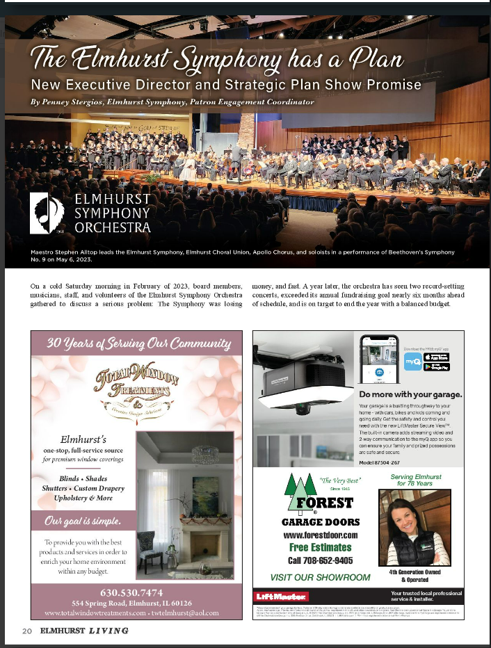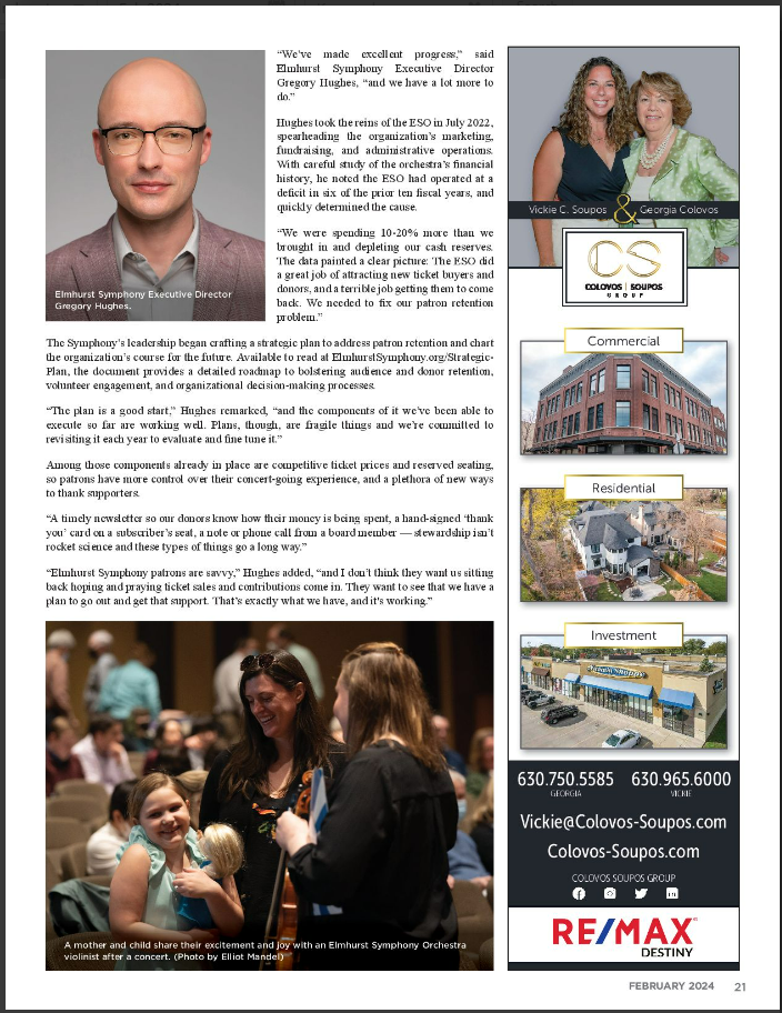 The Symphony’s leadership began crafting a strategic plan to address patron retention and chart the organization’s course for the future. Available to read at ElmhurstSymphony.org/Strategic-Plan, the document provides a detailed roadmap to bolstering audience and donor retention, volunteer engagement, and organizational decision-making processes.